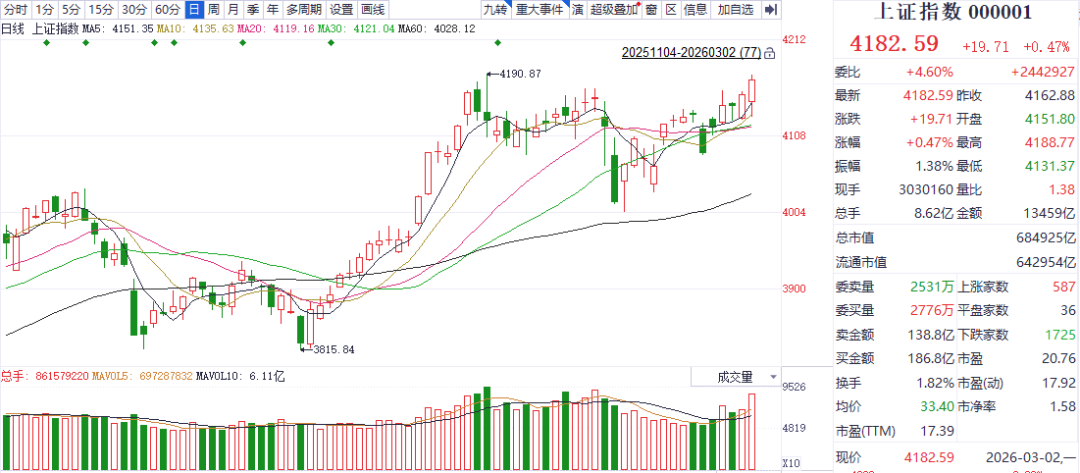截至收盘,上证指数报收4182.59点,上涨0.47%;深证成指报收14465.79点,下跌0.2%;创业板指报收3294.16点,下跌0.49%。沪深北三市成交额突破3万亿元大关,达到3.04万亿元,较上一交易日大幅放量近5400亿元。