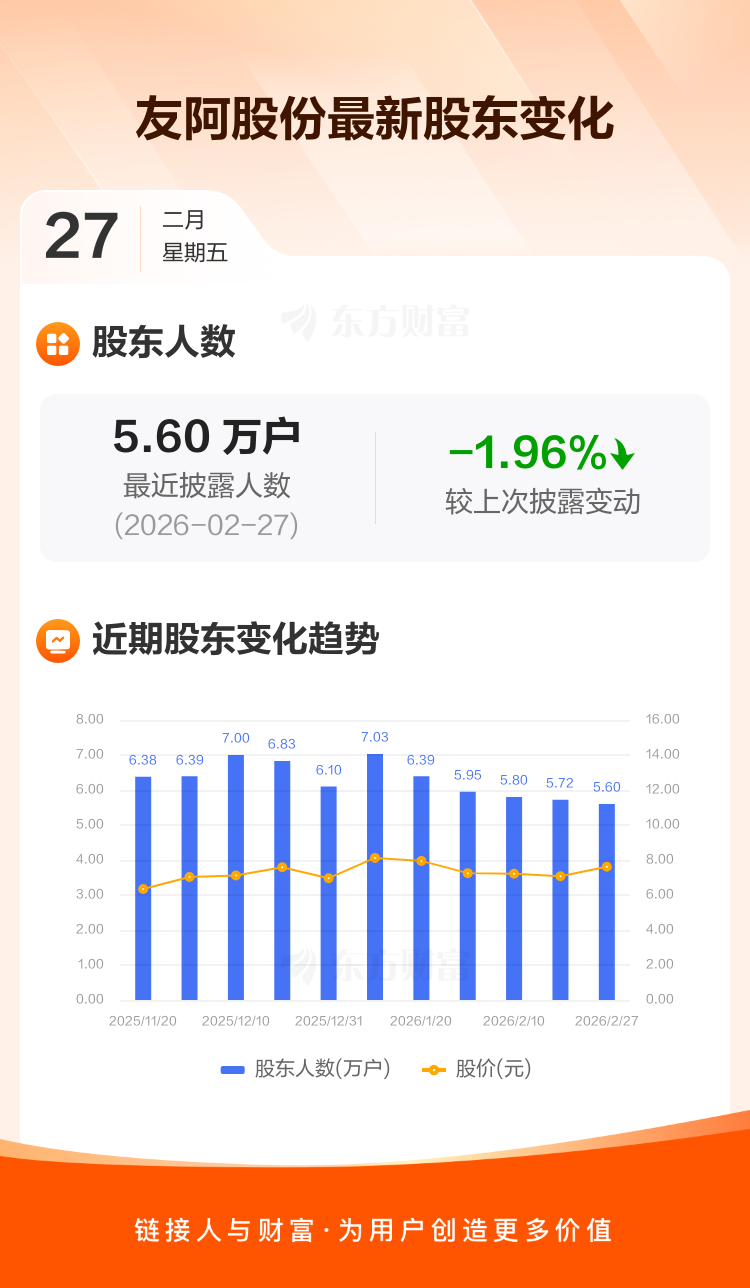 友阿股份最新披露数据显示,截至2月27日公司股东户数为5.60万户,较上期(2026年2月13日)减少1120户,降幅为1.96%。户均持有流通股数量由上期的2.44万股上升至2.49万股,户均持股金额由上期的17.24万元增加至18.93万元。