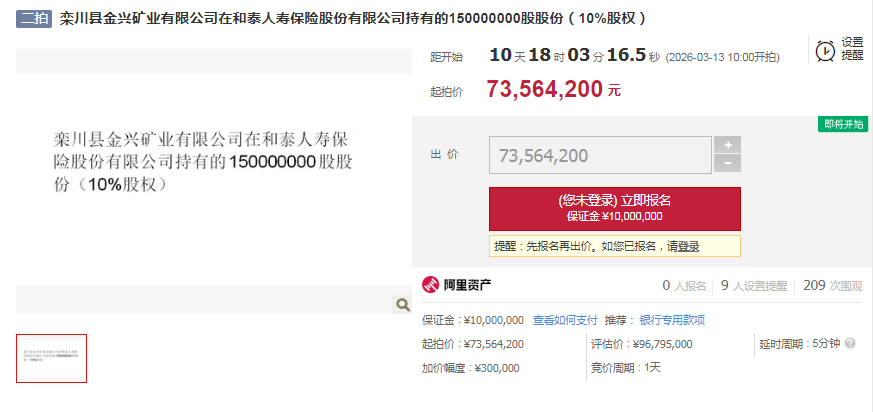 3月2日,《国际金融报》记者从阿里资产拍卖平台获悉,栾川县金兴矿业有限责任公司(下称“金兴矿业”)所持和泰人寿保险股份有限公司(下称“和泰人寿”)1.5亿股股份(10%股权)将于3月13日被司法拍卖,起拍价为7356.42万元。