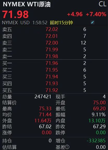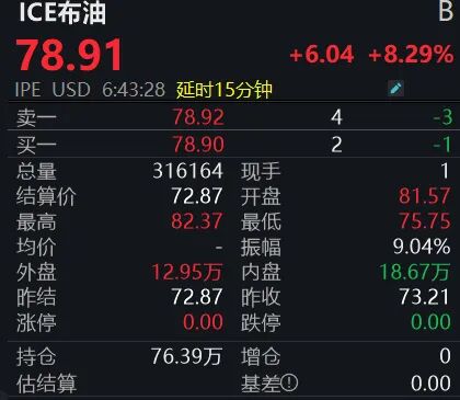 3月2日,国际原油市场开盘即现暴涨行情,布伦特原油开盘涨幅达13%,一度突破每桶82美元关口。截至记者发稿,布伦特原油大涨8.29%,报78.91美元/桶;WTI原油大涨7.4%,报71.98美元/桶。