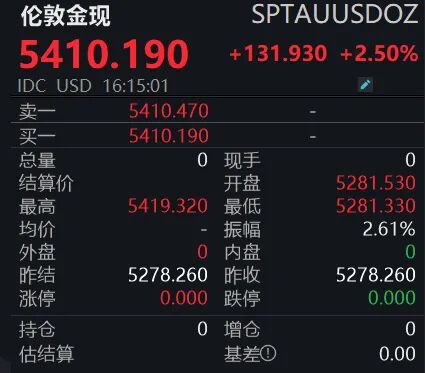 随着全球避险情绪持续升温,黄金价格也同步走高。截至记者发稿,伦敦金现日内大涨2.5%,交投于5410美元/盎司附近,盘中最高触及5419.32美元/盎司;COMEX黄金期货日内大涨3.33%,报5422.8美元/盎司,盘中最高触及5434.1美元/盎司。