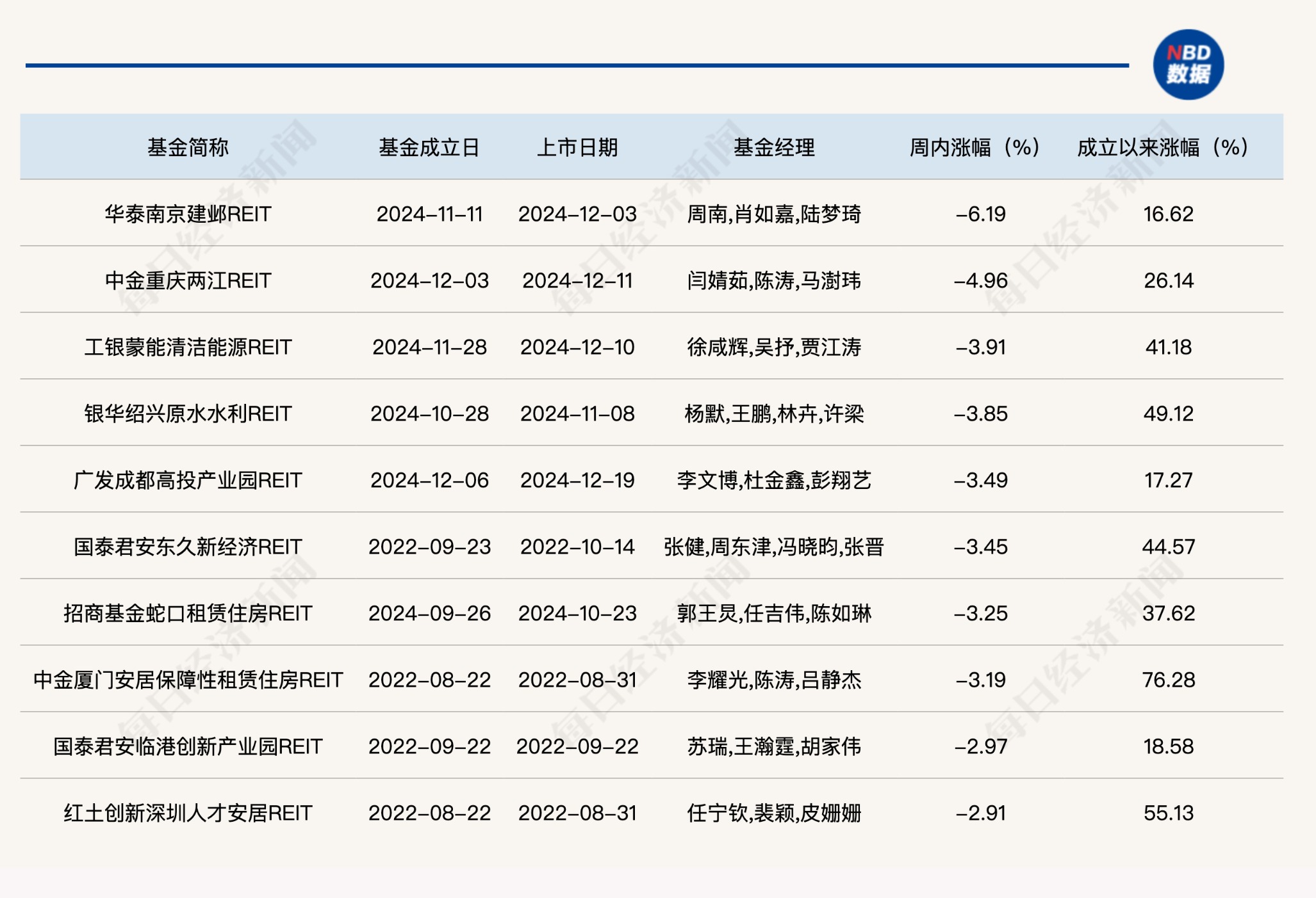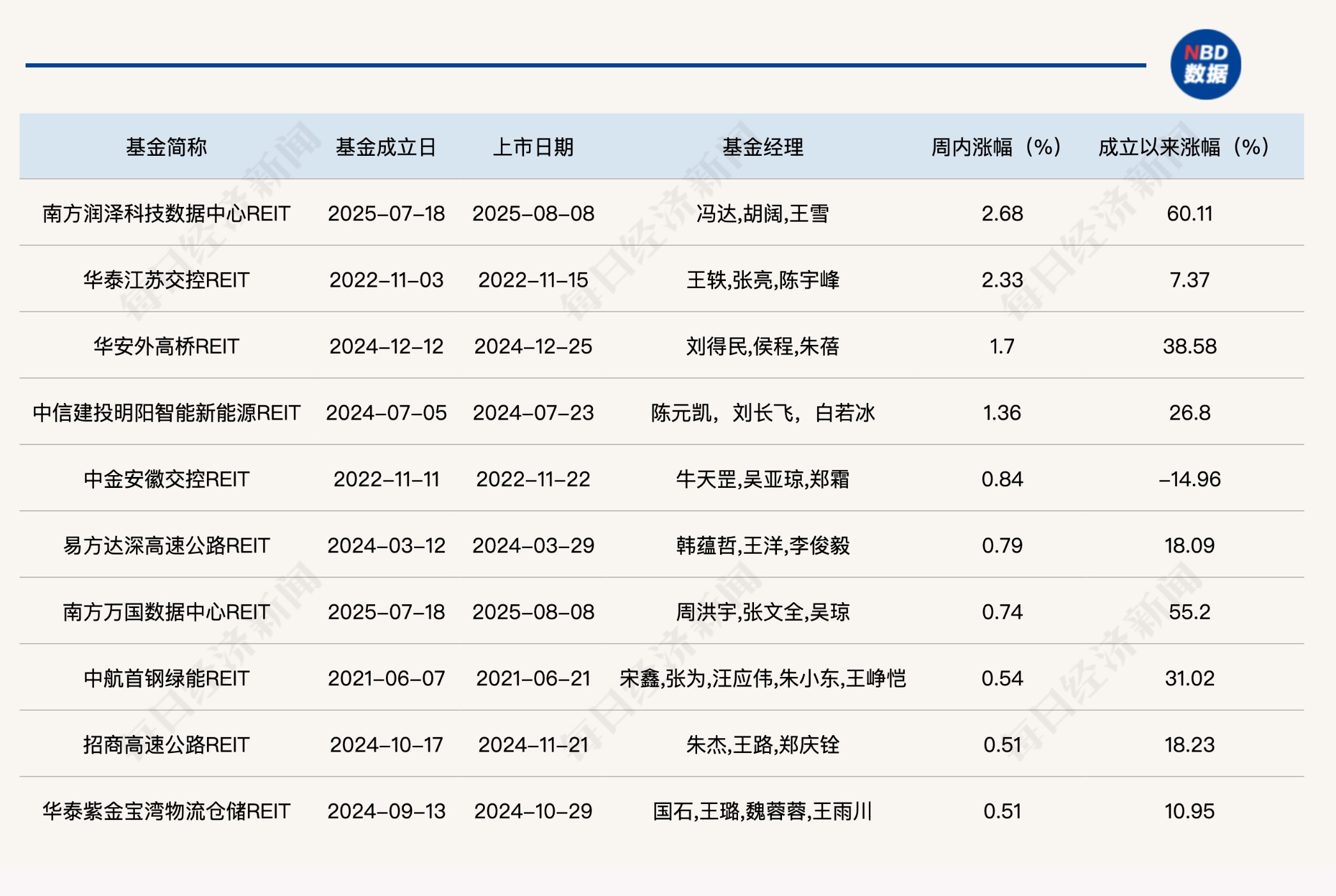 上周涨幅排名前十的公募REITs