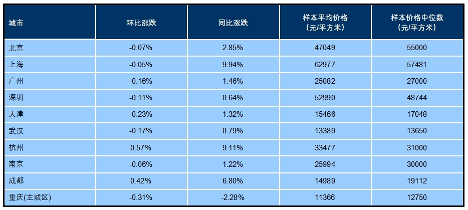 十大重点城市二手住宅平均价格为33399元/平方米,环比下跌0.42%。具体来看,南京、北京环比跌幅较大,均超过0.6%;上海、重庆(主城区)、广州、天津环比跌幅均在0.4%(含)~0.6%之间;成都和武汉环比跌幅均为0.39%;深圳和杭州跌幅均小于0.2%,其中杭州跌幅最小,为0.14%。