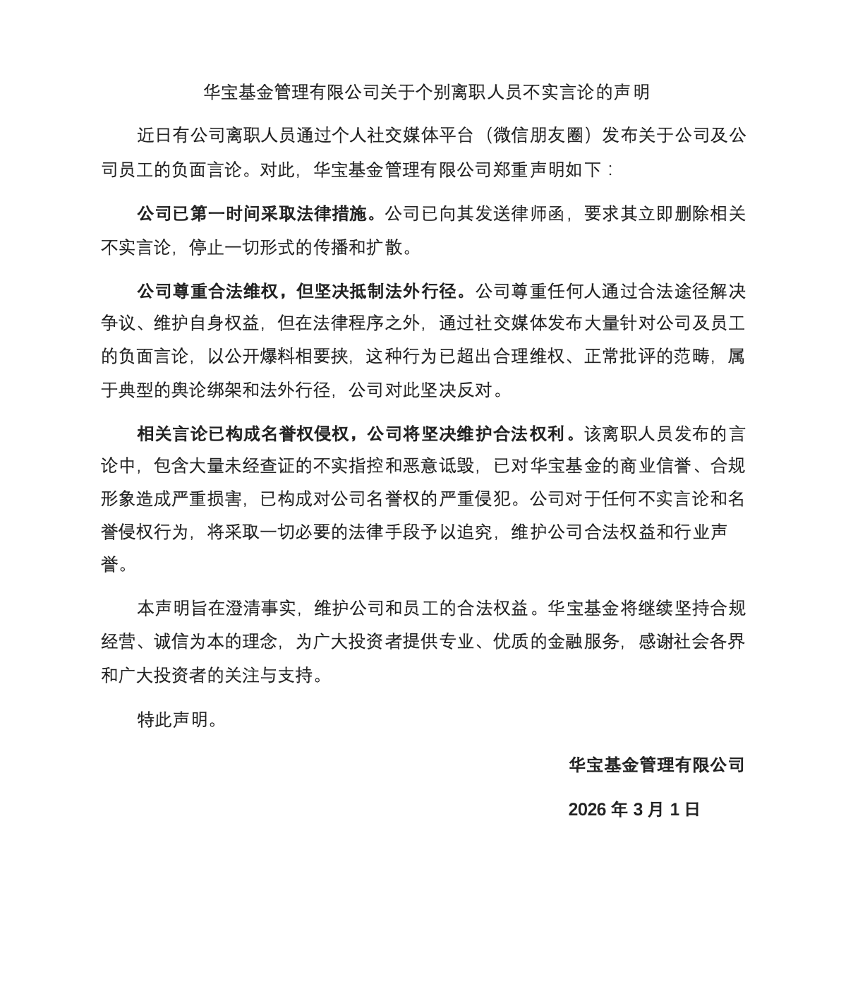 华宝基金3月1日发布声明称,近日有公司离职人员通过个人社交媒体平台发布关于公司及公司员工的负面言论。公司尊重任何人通过合法途径解决争议、维护自身权益,但在法律程序之外,通过社交媒体发布大量针对公司及员工的负面言论,以公开爆料相要挟,这种行为已超出合理维权、正常批评的范畴,属于典型的舆论绑架和法外行径,公司对此坚决反对。相关言论已构成名誉权侵权,公司将坚决维护合法权利。