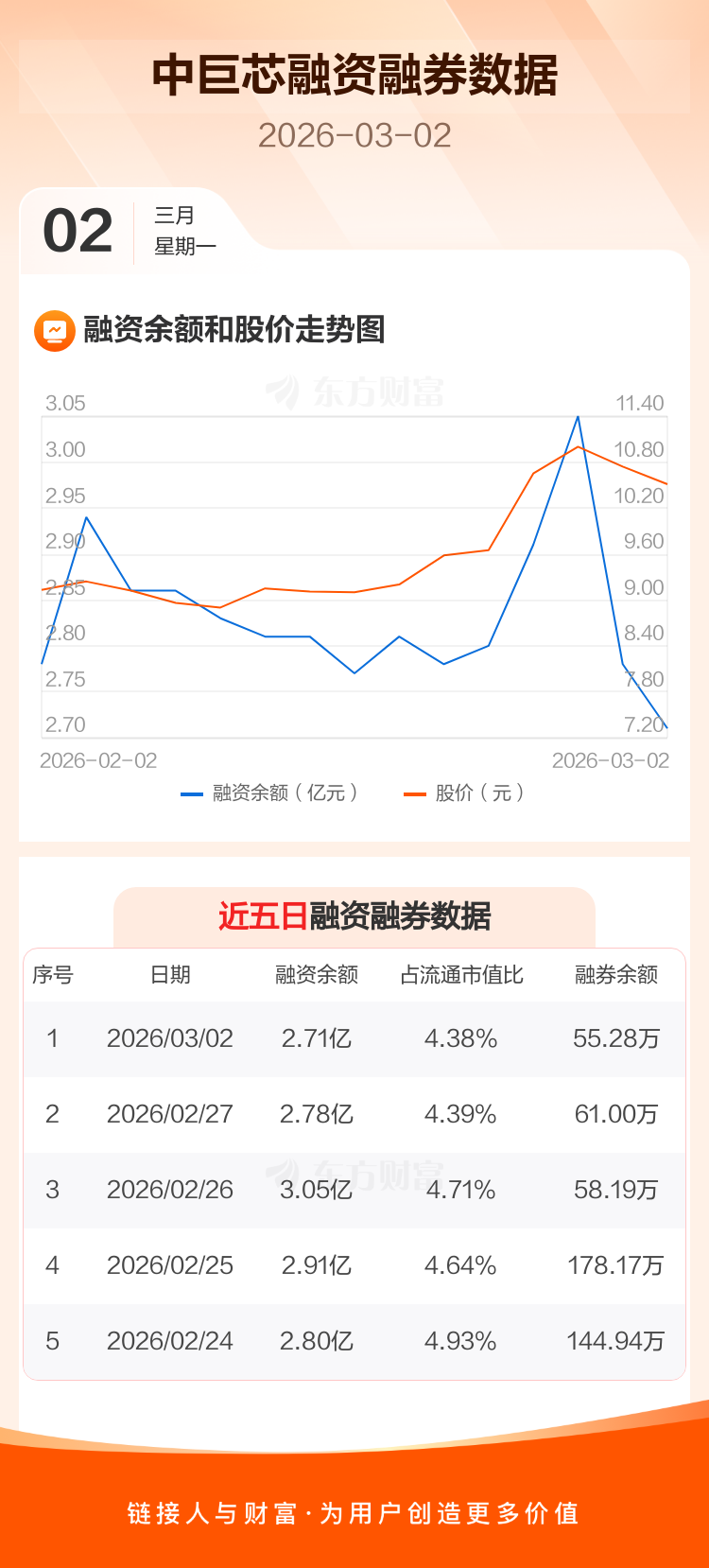 交易所最新数据显示,中巨芯于2026年3月2日获融资买入2494.64万元,融资偿还3160.69万元,当日融资净偿还666.05万元。目前,该股融资余额2.71亿,占流通市值比例为4.38%。