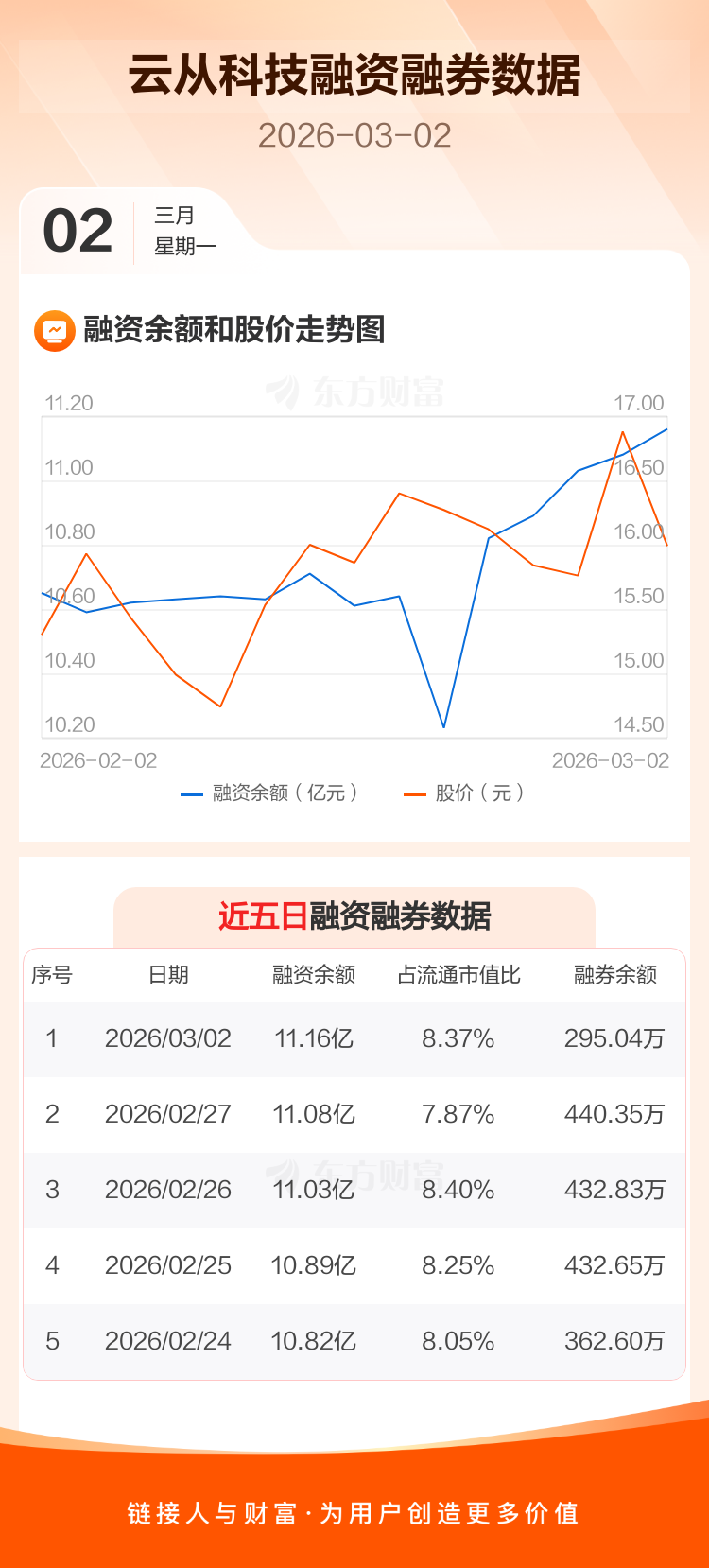 交易所最新数据显示,云从科技于2026年3月2日获融资买入9968.28万元,融资偿还9163.37万元,当日融资净买入804.91万元。目前,该股融资余额11.16亿,占流通市值比例为8.37%。