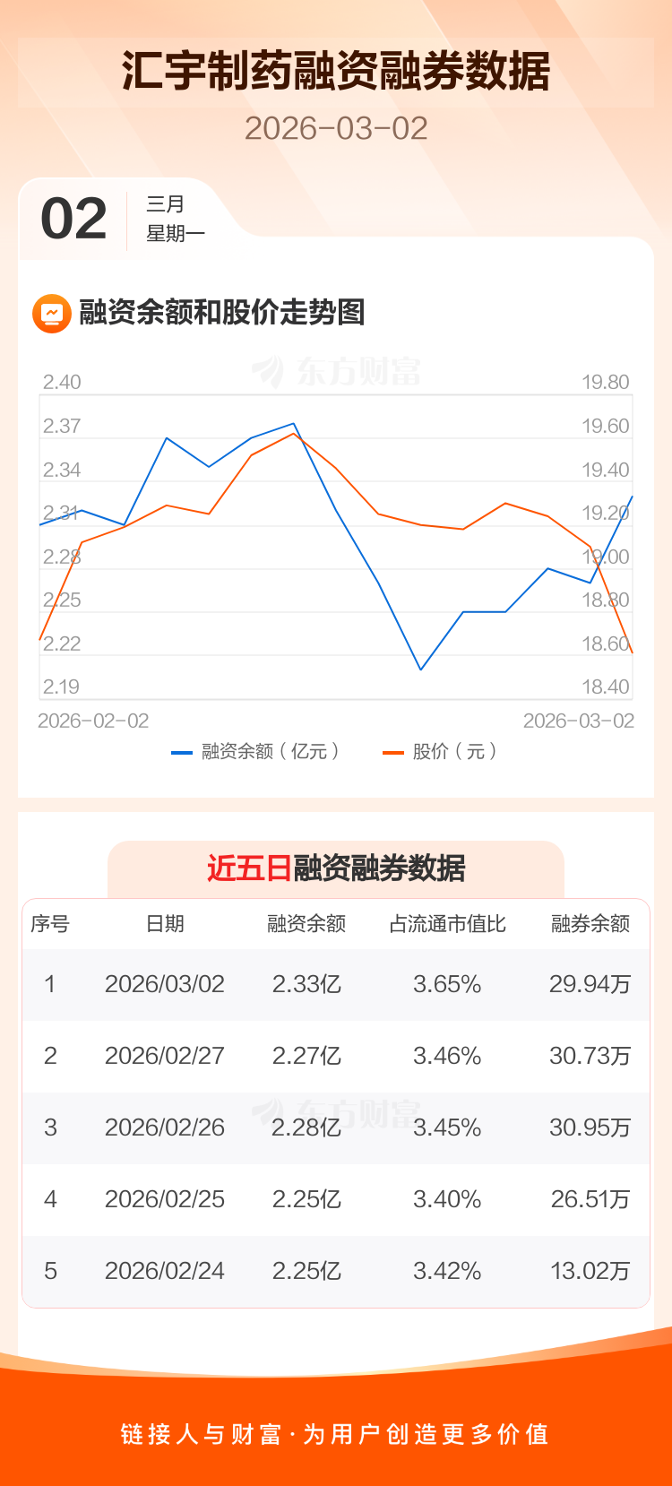 交易所最新数据显示,汇宇制药于2026年3月2日获融资买入1264.04万元,融资偿还673.76万元,当日融资净买入590.29万元。目前,该股融资余额2.33亿,占流通市值比例为3.65%。
