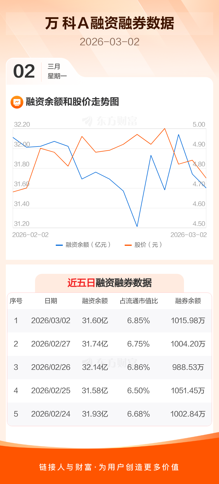 交易所最新数据显示,万 科A于2026年3月2日获融资买入5887.12万元,融资偿还7234.99万元,当日融资净偿还1347.88万元。目前,该股融资余额31.60亿,占流通市值比例为6.85%。