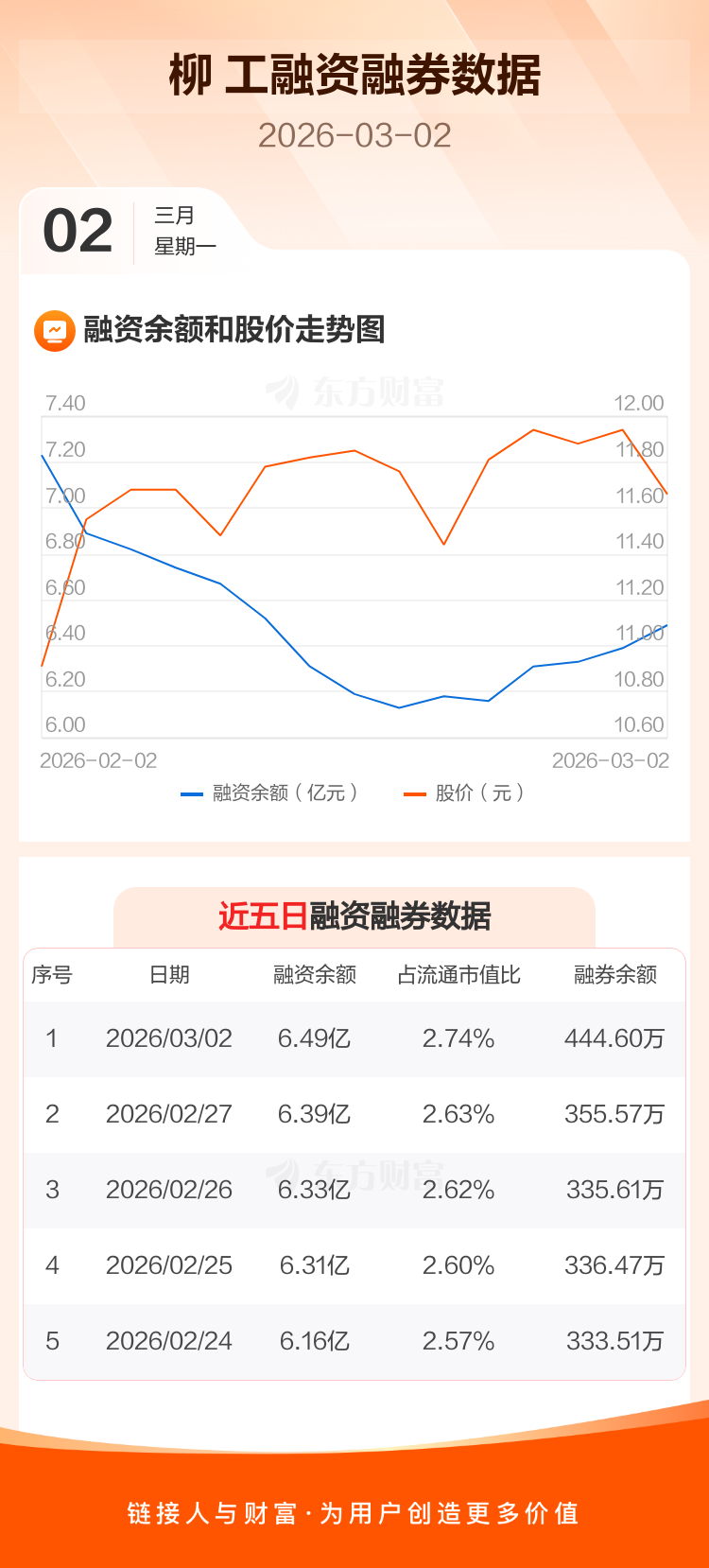 交易所最新数据显示,柳 工于2026年3月2日获融资买入4792.57万元,融资偿还3769.03万元,当日融资净买入1023.54万元。目前,该股融资余额6.49亿,占流通市值比例为2.74%。