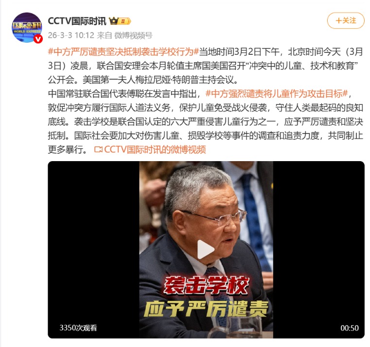 中国常驻联合国代表傅聪在发言中指出,中方强烈谴责将儿童作为攻击目标,敦促冲突方履行国际人道法义务,保护儿童免受战火侵袭,守住人类最起码的良知底线。袭击学校是联合国认定的六大严重侵害儿童行为之一,应予严厉谴责和坚决抵制。国际社会要加大对伤害儿童、损毁学校等事件的调查和追责力度,共同制止更多暴行。