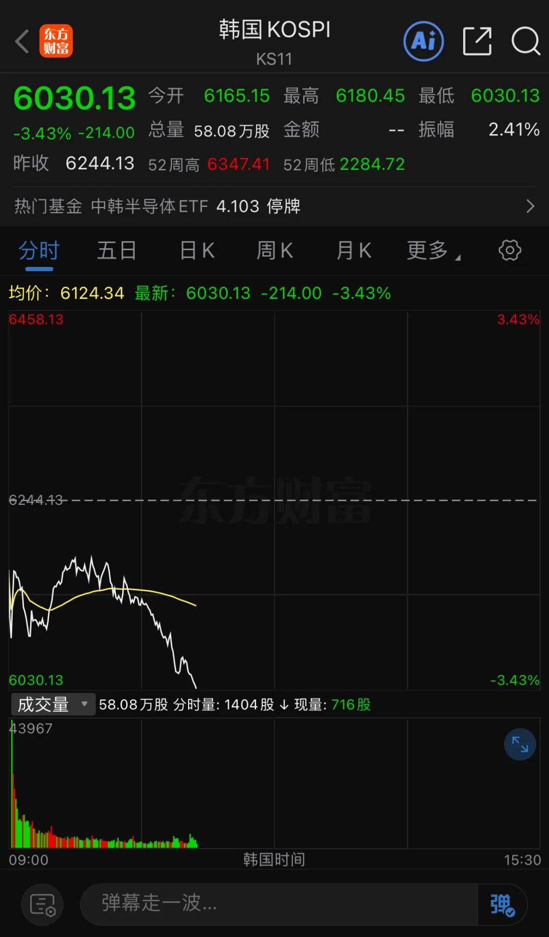 截至发稿,日经225指数跌幅扩大,现跌2.0%,最新报56889.59点。韩国KOSPI指数下跌3.43%至6030.13点。