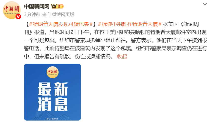 警方表示,他们在当天下午接到报警电话,此前特勤局在该建筑内发现了这个包裹。纽约市警察局表示调查仍在进行中,但未报告有疏散、伤亡或逮捕情况。