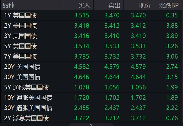 具体来看,10年期美国国债单日盘中上行2.47个bp,回到3.970%附近。短中期品种调整更为剧烈,2年期、3年期、5年期、7年期美债当日均有超过3个bp的上行幅度。长端30年期美国国债也上行3.15个bp。