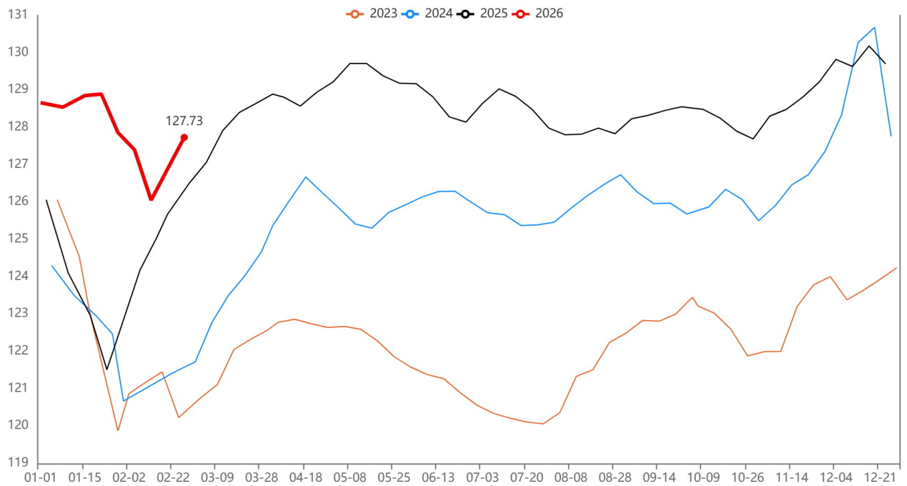生猪出栏体重与猪价通常呈现正相关关系:猪价越高,养殖利润越好,出栏体重越大。更重要的是,出栏体重的变化隐含着市场对后市的预期——体重大意味着压栏惜售、活体库存累积,后市出栏压力增加;体重小意味着提前出栏、库存去化,后市压力减轻。涌益咨询数据显示,春节后第一周全国生猪出栏均重达到127.73公斤,较春节前增加1.68公斤,处于近4年同期最高水平。这一数据直观表明,短期生猪供应充足,出栏压力较大。