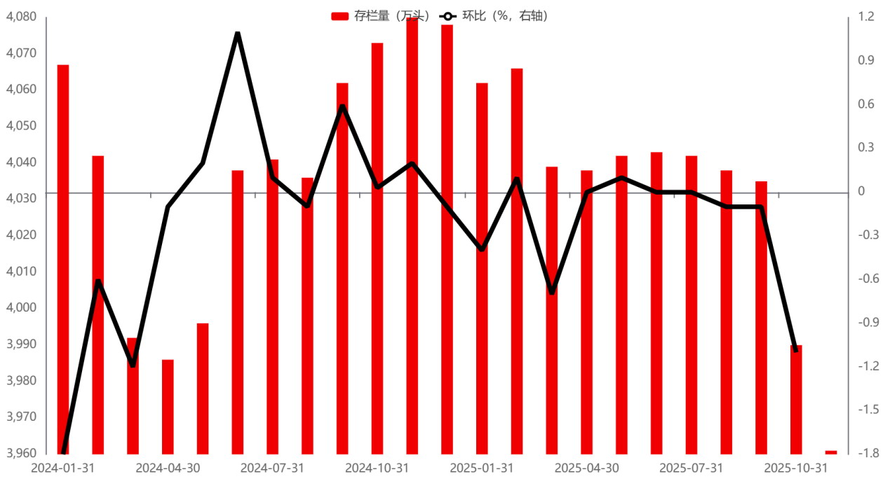 图为2024—2025年能繁母猪存栏量及环比变化