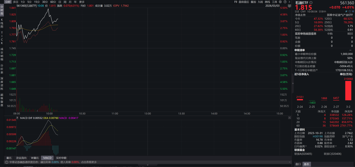 规模与流动性俱佳。截至2026年3月3日,石油ETF规模65.95亿元,是标的指数为中证油气产业指数的ETF中流通规模最大的ETF。近期获得大额净申购,规模迎来翻倍,二级市场交投活跃,买卖冲击成本低。
