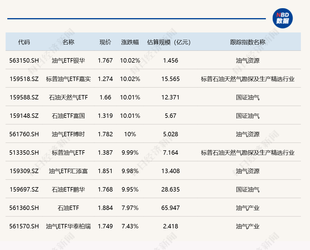 ETF涨跌幅方面,多只油气相关ETF涨停。