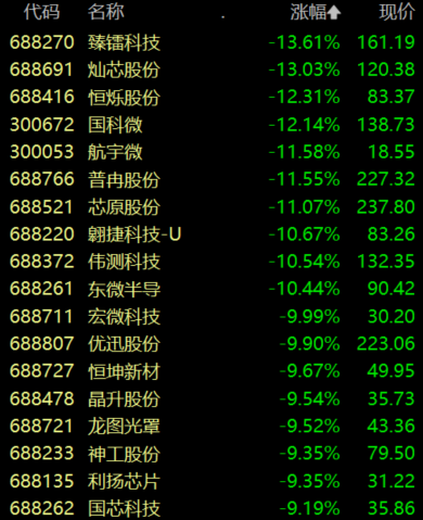 半导体板块调整,臻镭科技、灿芯股份跌超13%,恒烁股份、国科微跌超12%。