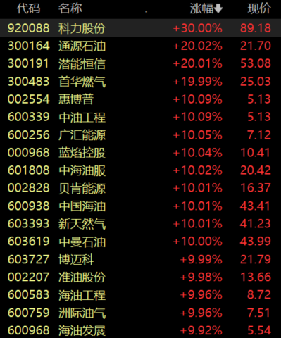 具体来看,油气板块掀涨停潮,科力股份、通源石油、首华燃气等10余股涨停。