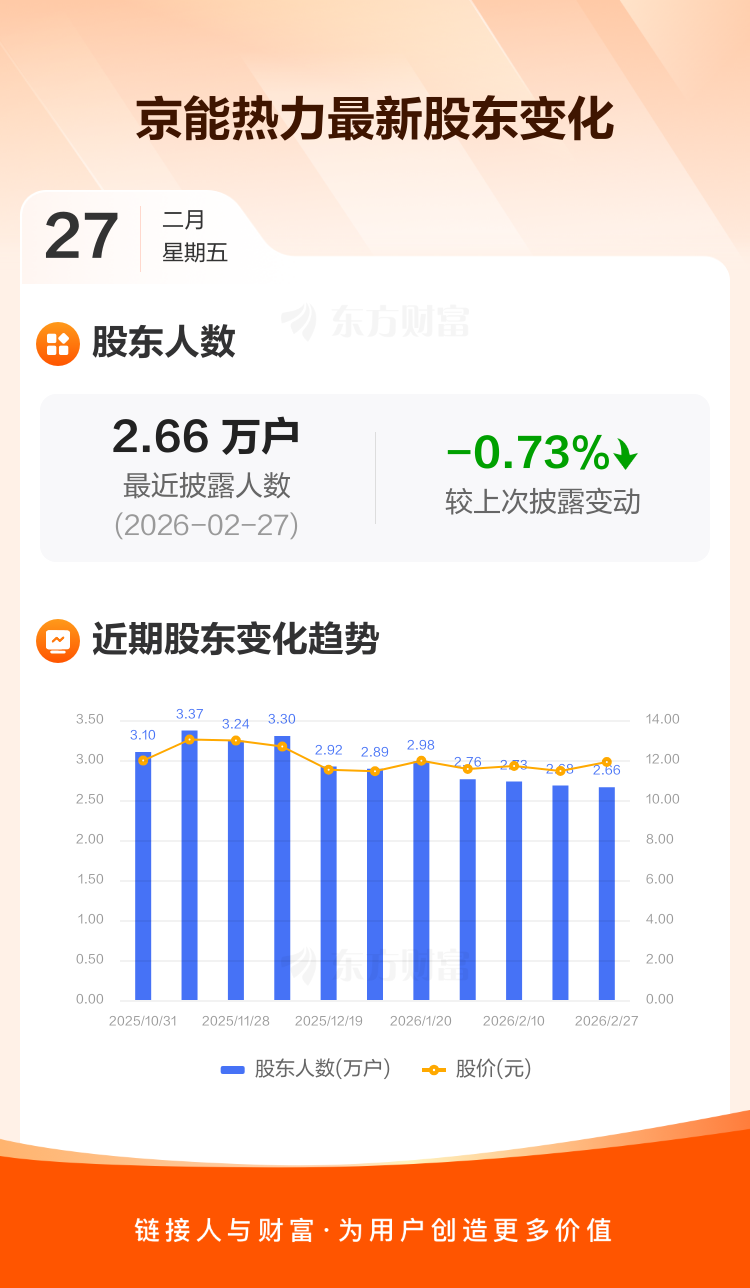 京能热力:截至2月27日最新股东户数2.66万户,较上期减少0.73%