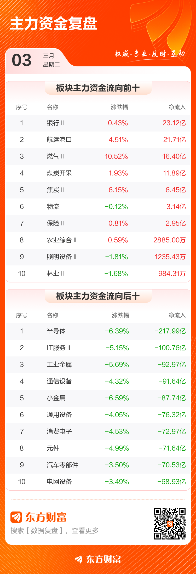 3月3日,沪指跌1.43%,深成指跌3.07%,创业板指跌2.57%。两市成交额3.13万亿,较上个交易日放量1088亿。数据显示,今日大盘主力资金净流出2134.07亿。银行Ⅱ、航运港口、燃气Ⅱ等板块主力资金流入排名居前,其中银行Ⅱ净流入23.12亿元。