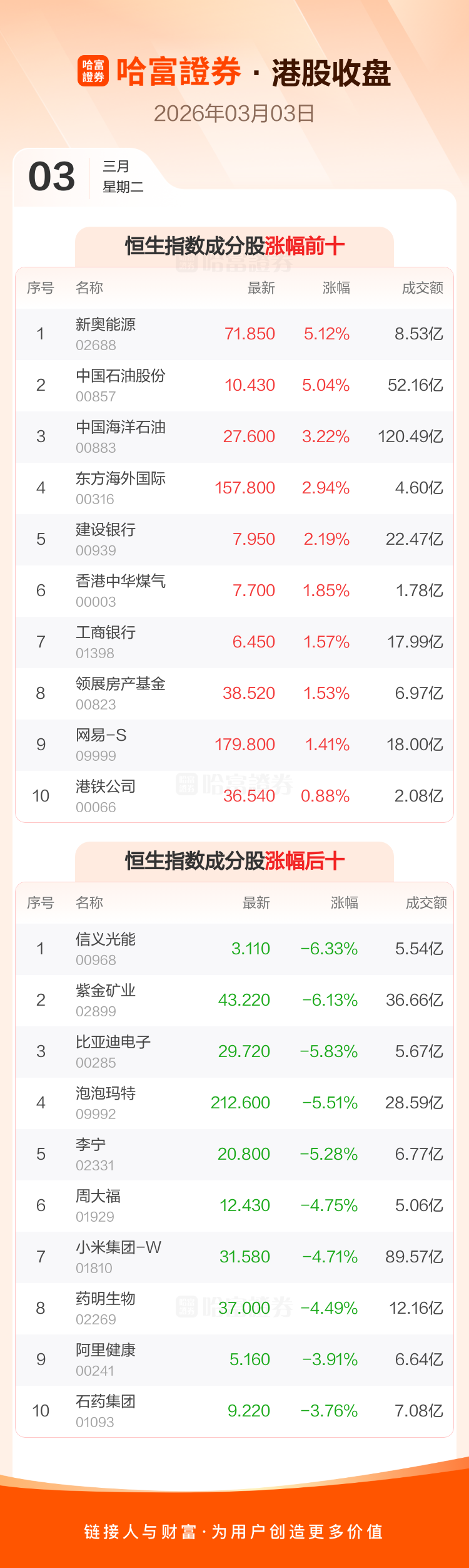 港股3月3日收盘走低 ,恒生指数收报25768.08点,跌291.77点,跌幅1.12%;恒生科技指数收报4876.53点,跌112.84点,跌幅2.26%。恒生指数成分股中新奥能源、中国石油股份、中国海洋石油涨幅居前,信义光能、紫金矿业、比亚迪电子跌幅靠前。恒生科技指数成分股中网易-S、金山软件、腾讯音乐-SW涨幅居前,零跑汽车、比亚迪电子、小鹏汽车-W跌幅靠前。
