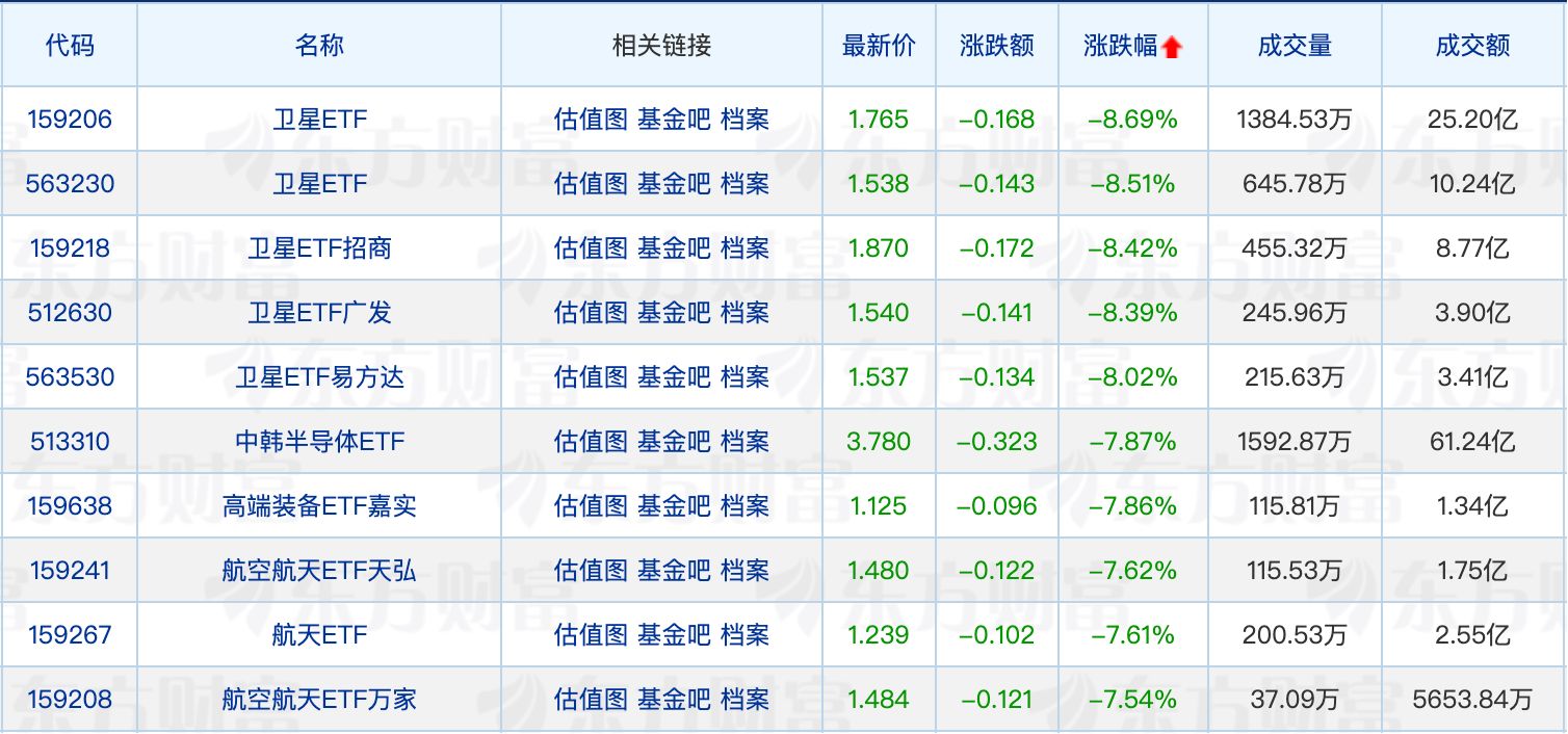 下跌方面,卫星ETF跌超8%。