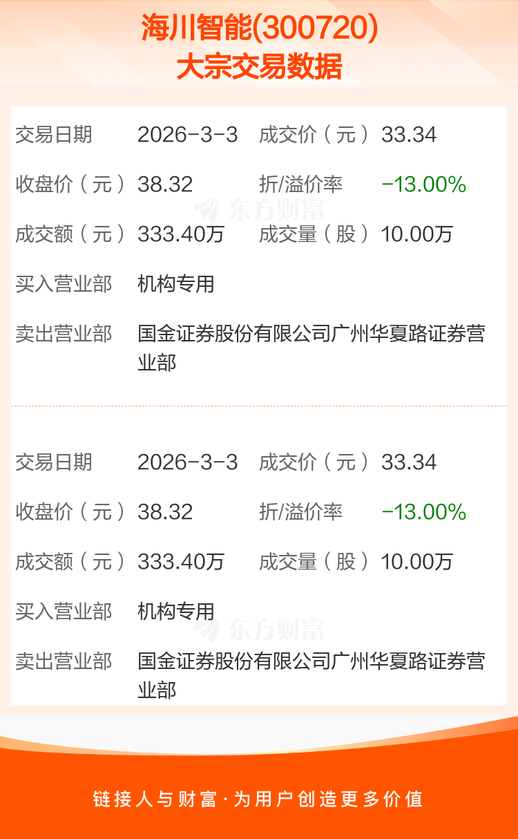 2026年3月3日,海川智能发生2笔大宗交易,共成交20.00万股,成交金额666.80万元,占其流通市值比例为0.10%。