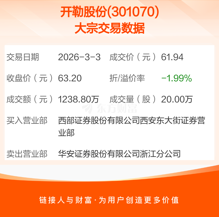 2026年3月3日,开勒股份发生1笔大宗交易,共成交20.00万股,成交金额1238.80万元,占其流通市值比例为0.33%。