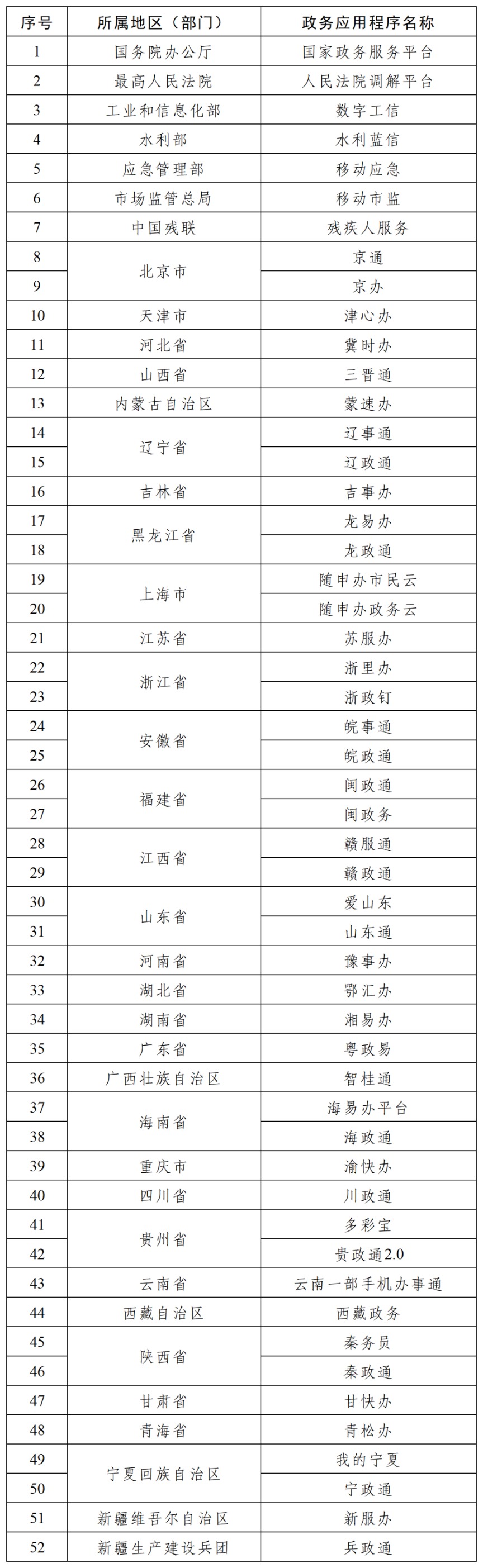 《政务移动互联网应用程序规范化管理办法》印发实施以来,国家网信办会同有关部门加快推进政务移动互联网应用程序(以下简称政务应用程序)规范化管理工作,指导督促主办(使用)单位开展政务应用程序备案,并对“国家政务服务平台”“人民法院调解平台”“数字工信”“京办”“津心办”“浙政钉”“闽政通”等第一批52款政务应用程序完成备案。