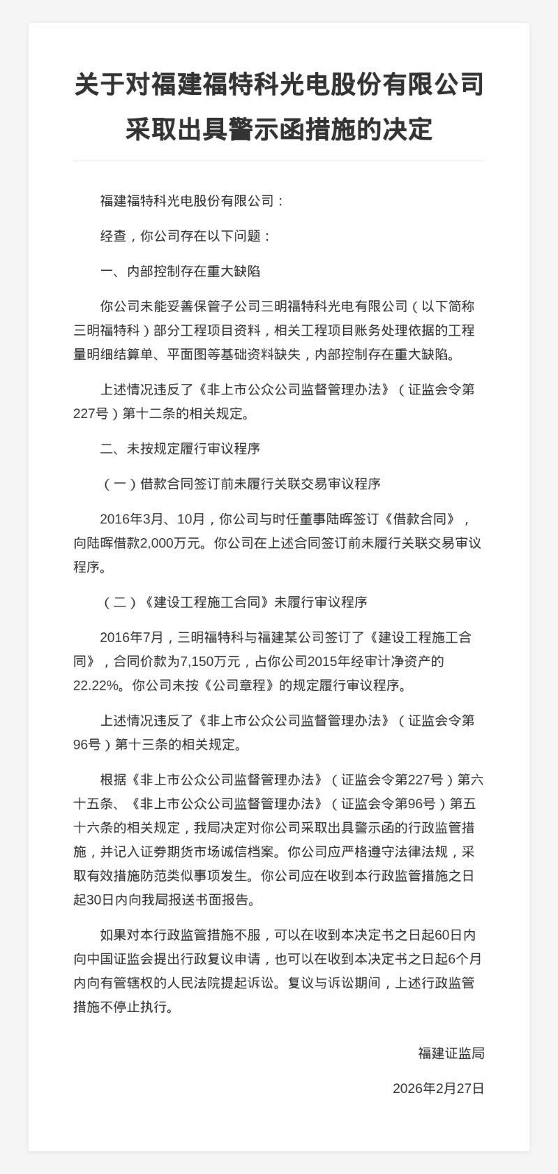 上述情况违反了《非上市公众公司监督管理办法》的相关规定。福建证监局决定对福建福特科光电股份有限公司采取出具警示函的行政监管措施,并记入证券期货市场诚信档案。