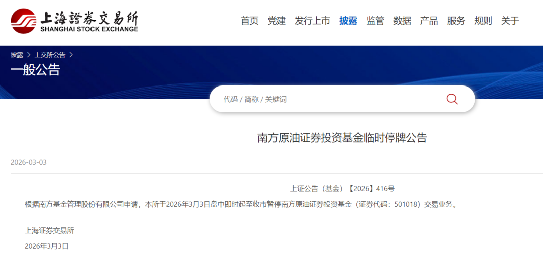3月3日中午,上海证券交易所发布公告称,根据南方基金管理股份有限公司申请,上海证券交易所于2026年3月3日盘中即时起至收市暂停南方原油证券投资基金交易业务。