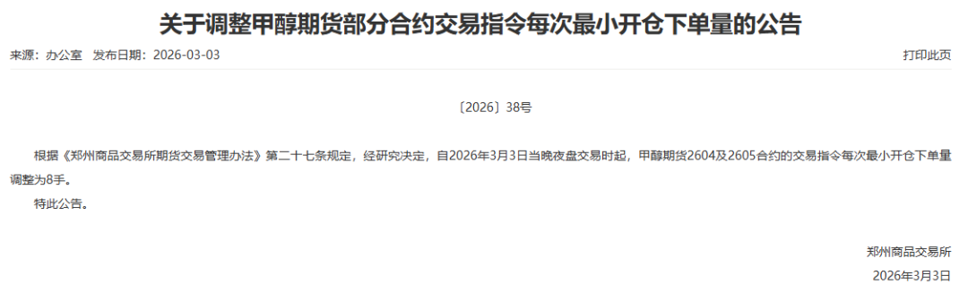 郑商所公告,经研究决定,自2026年3月3日当晚夜盘交易时起,甲醇期货2604及2605合约的交易指令每次最小开仓下单量调整为8手。