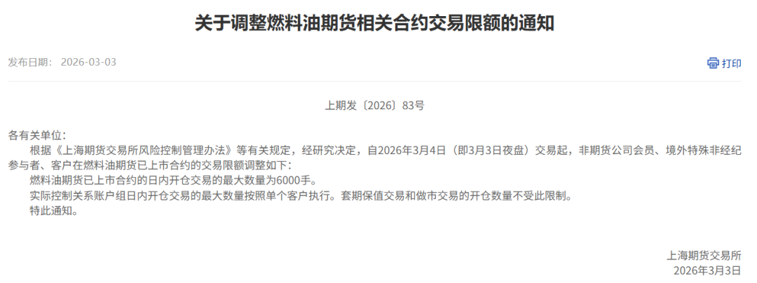 上期所通知,经研究决定,自2026年3月4日(即3月3日夜盘)交易起,非期货公司会员、境外特殊非经纪参与者、客户在燃料油期货已上市合约的日内开仓交易最大数量为6000手。