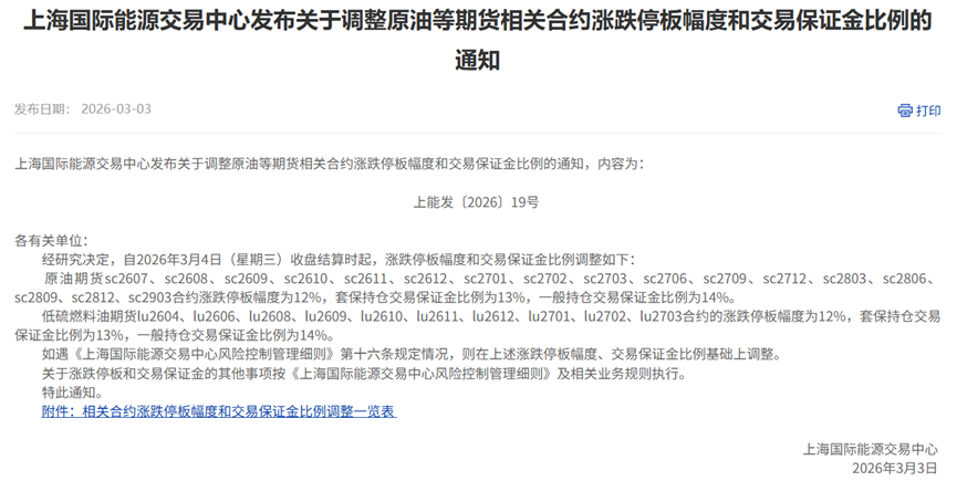 上期能源还通知,经研究决定,自2026年3月4日(星期三)收盘结算时起,涨跌停板幅度和交易保证金比例调整如下: