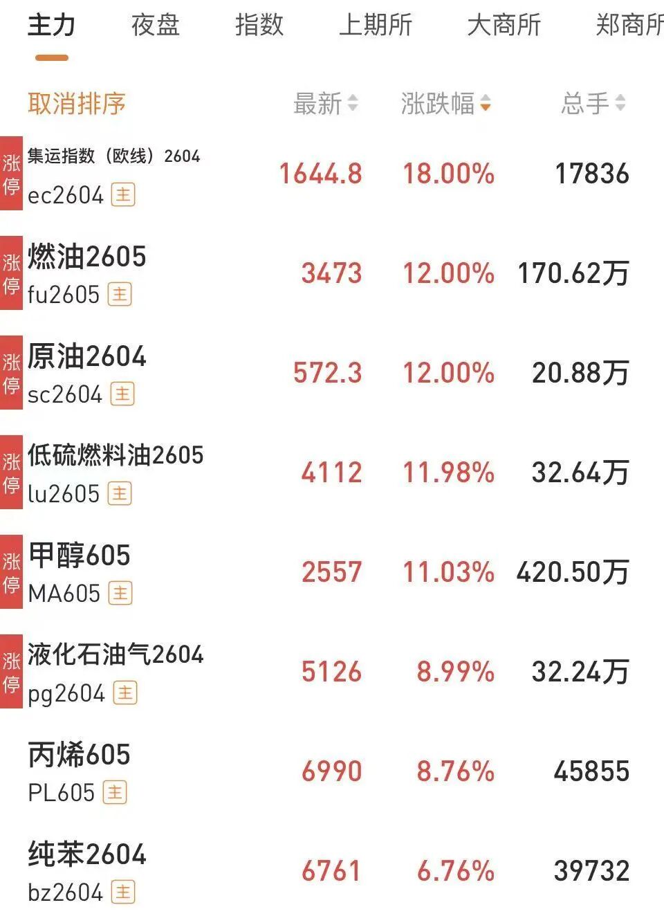 3月3日,国内能化类期货多个品种继续大涨。截至15时收盘,原油、燃料油、低硫燃料油、甲醇、液化石油气、集运指数(欧线)期货主力合约均涨停。