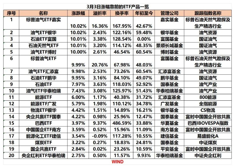 受中东局势紧张升级的影响,石油天然气板块再度大涨,带动相关ETF产品掀起涨停潮。截至收盘,油气ETF银华、标普油气ETF嘉实、石油ETF富国等8只ETF产品封板。此外,多只与“HALO交易”相关的ETF产品单日涨幅居前,比如广发、银华旗下能源ETF单日涨幅在6%左右,国泰煤炭ETF单日涨幅超3%。