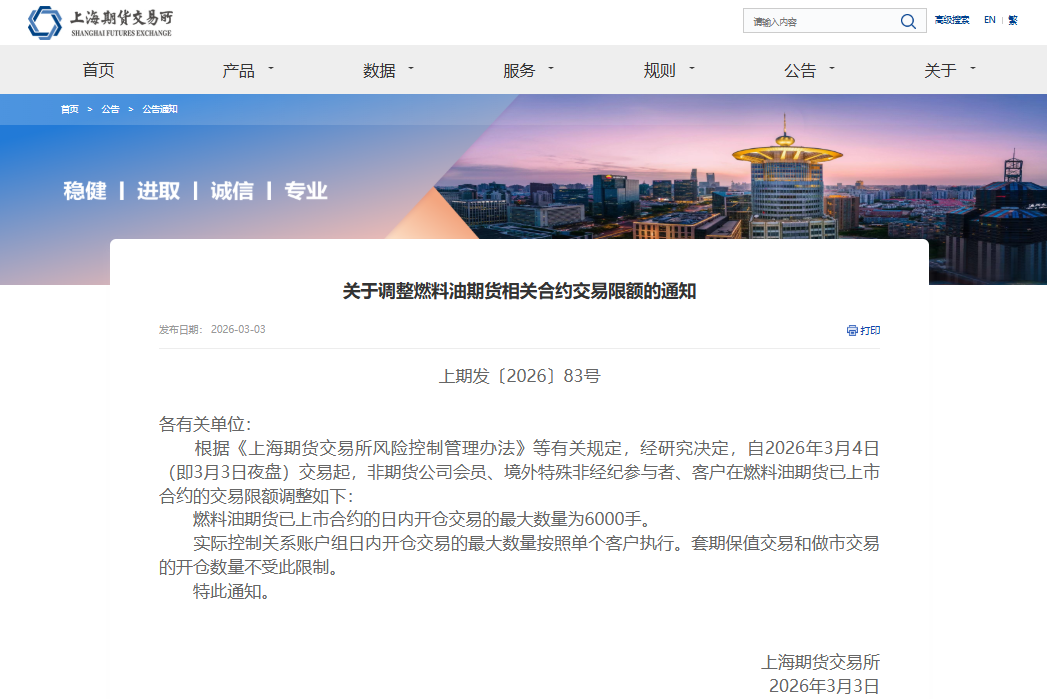 此外,上期所还发布了关于调整燃料油期货相关合约交易限额的通知。自2026年3月4日(即3月3日夜盘)交易起,非期货公司会员、境外特殊非经纪参与者、客户在燃料油期货已上市合约的交易限额调整如下: