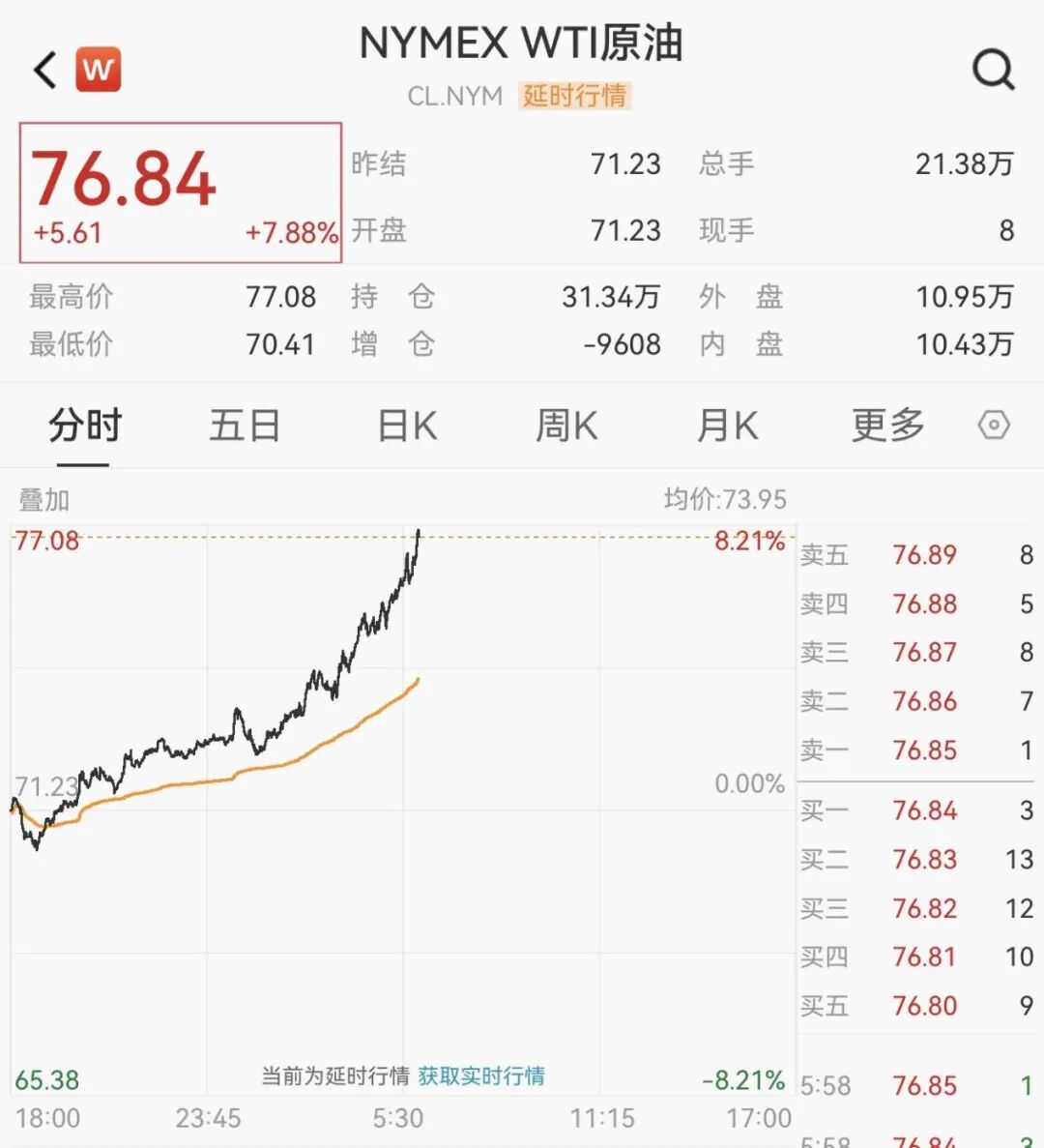 WTI原油一度突破77美元/桶,现涨7.88%。