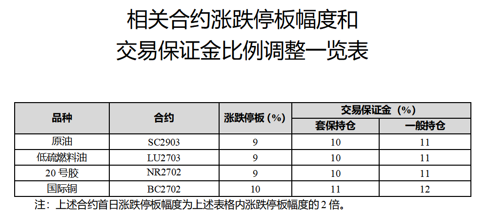 原油SC2903、低硫燃料油LU2703、20号胶NR2702合约的涨跌停板幅度调整为9%,套保持仓交易保证金比例调整为10%,一般持仓交易保证金比例调整为11%;