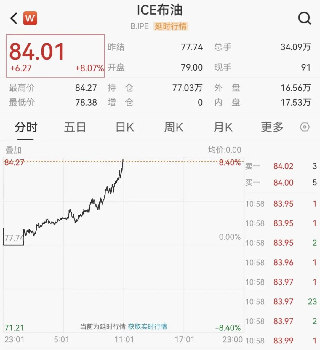 由于中东冲突引发对供应中断的担忧,布伦特原油突破84美元/桶,日内涨超8%。
