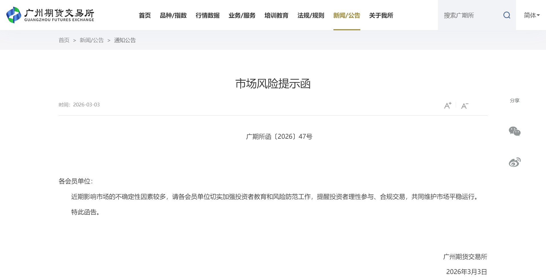 其中,广期所发布市场风险提示函称,近期影响市场的不确定性因素较多,请各会员单位切实加强投资者教育和风险防范工作,提醒投资者理性参与、合规交易,共同维护市场平稳运行。