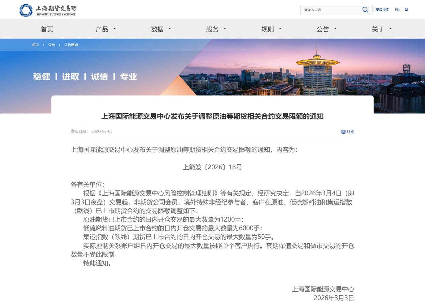上海国际能源交易中心发布通知,经研究决定,自2026年3月4日(即3月3日夜盘)交易起,非期货公司会员、境外特殊非经纪参与者、客户在原油、低硫燃料油和集运指数(欧线)已上市期货合约的交易限额调整如下:原油期货已上市合约的日内开仓交易的最大数量为1200手;低硫燃料油期货已上市合约的日内开仓交易的最大数量为6000手;集运指数(欧线)期货已上市合约的日内开仓交易的最大数量为50手。实际控制关系账户组日内开仓交易的最大数量按照单个客户执行。套期保值交易和做市交易的开仓数量不受此限制。