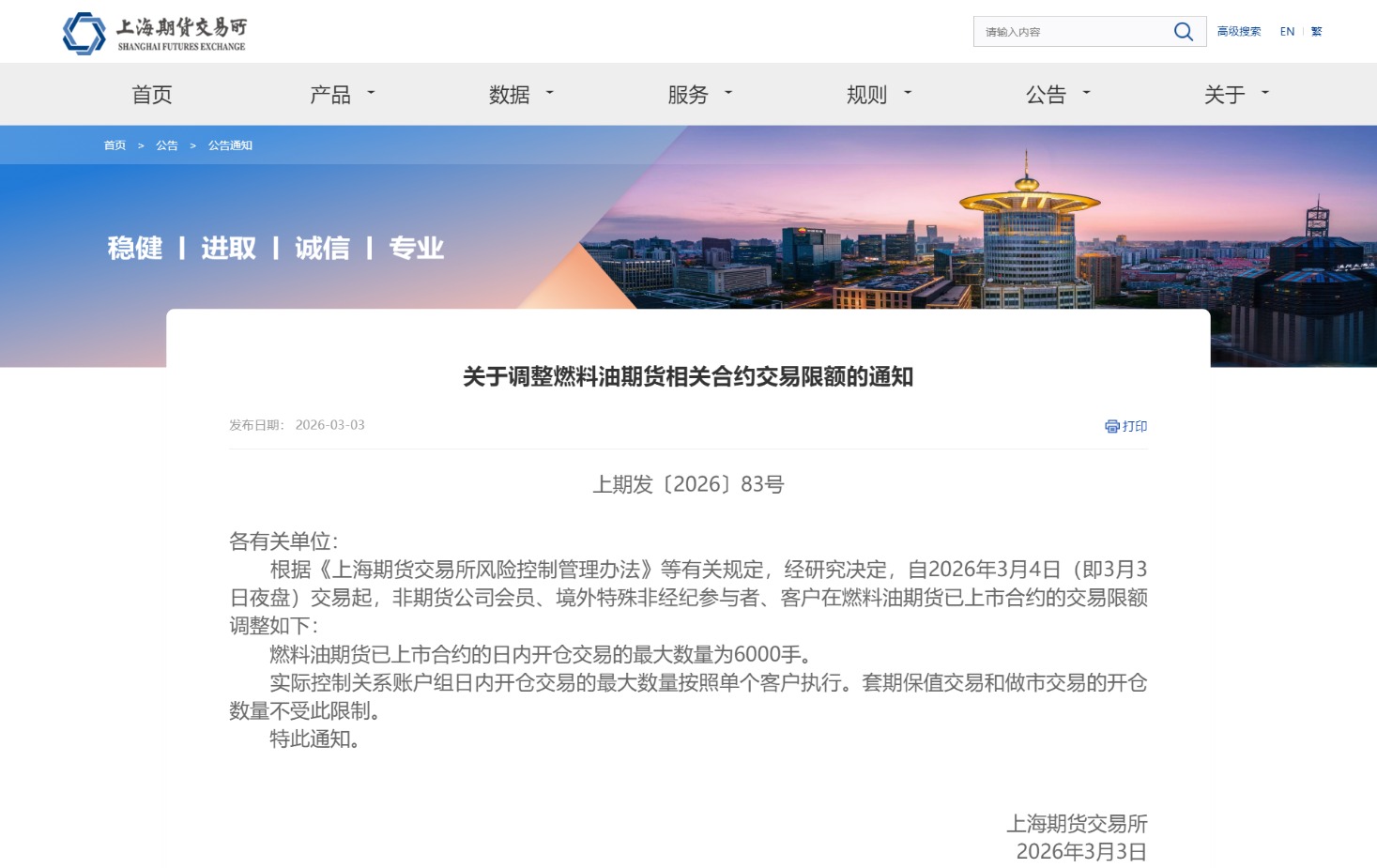 上期所发布通知,经研究决定,自2026年3月4日(即3月3日夜盘)交易起,非期货公司会员、境外特殊非经纪参与者、客户在燃料油期货已上市合约的交易限额调整如下:燃料油期货已上市合约的日内开仓交易的最大数量为6000手。实际控制关系账户组日内开仓交易的最大数量按照单个客户执行。套期保值交易和做市交易的开仓数量不受此限制。
