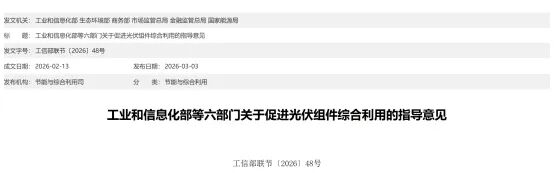 据工业和信息化部网站显示,3月3日,工业和信息化部等六部门联合发布《关于促进光伏组件综合利用的指导意见》,立足光伏产业绿色发展需求,明确未来一段时期光伏组件综合利用的发展目标、攻坚有价组分提纯等核心技术,同时从行业规范、金融支持等多维度出台配套措施,为光伏组件综合利用产业划定发展路径,推动光伏产业构建绿色循环发展体系。