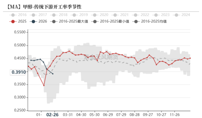 MTO需求当前也偏弱,主要由于2025年底伊朗装置季节性停车降负后,国内甲醇价格开始反弹,但年底烯烃需求偏弱,导致MTO利润大幅压缩,沿海两套MTO装置陆续停车。MTO需求占比甲醇下游需求50%以上,MTO装置对甲醇价格影响最为直接,近两日随着甲醇价格大幅上涨,MTO利润再度大幅压缩,预计前期停车的两套MTO装置短期重启可能性不大,另外部分MTO装置由于利润快速压缩也存在停车检修的可能性。若甲醇继续上涨,将增大MTO装置停车的概率,带来需求的负反馈。