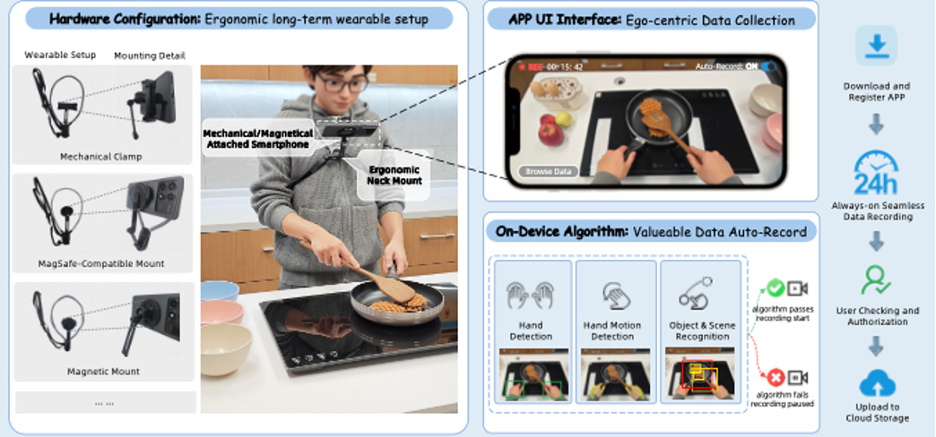 3月3日,记者获悉,由蚂蚁数科天玑实验室团队研发的AoE(Always-On Egocentric)持续性第一人称视频采集框架,提出了一种轻量化且低成本的具身数据采集方案。通过一台手机和一个低于20美元的颈挂式支架,就可以替代动辄数万美元的专业设备,实现具身智能的高质量数据采集。
