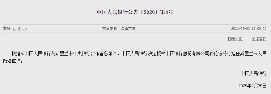 中新网3月3日电据央行网站消息,根据《中国人民银行与斯里兰卡中央银行合作备忘录》,中国人民银行决定授权中国银行股份有限公司科伦坡分行担任斯里兰卡人民币清算行。