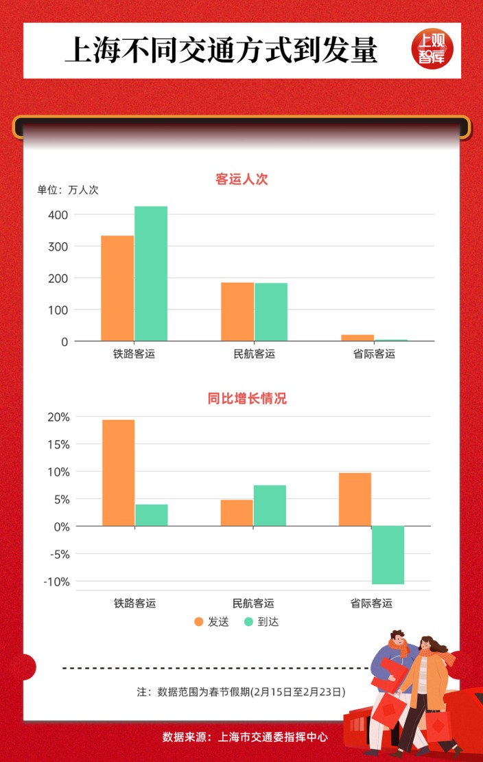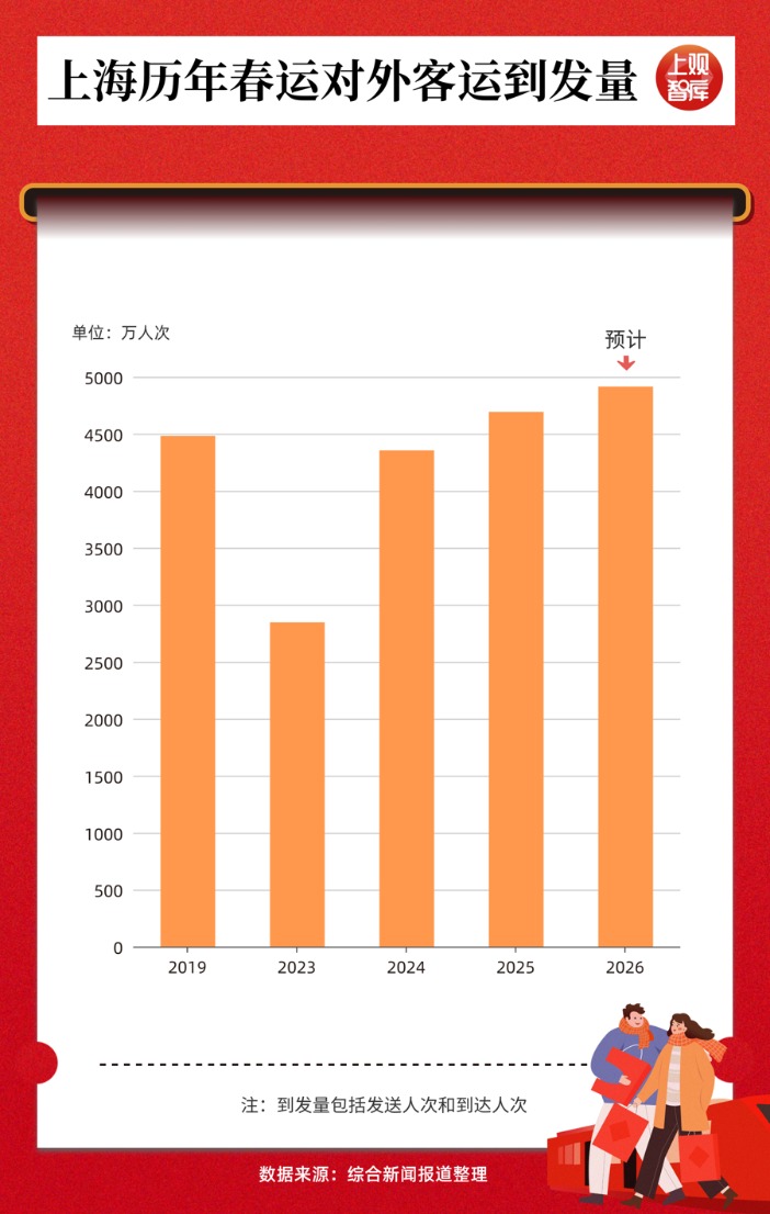 至3月13日春运结束,上海预计对外客运到发总量将达4915万人次,同比增长5%,达到历史新高。