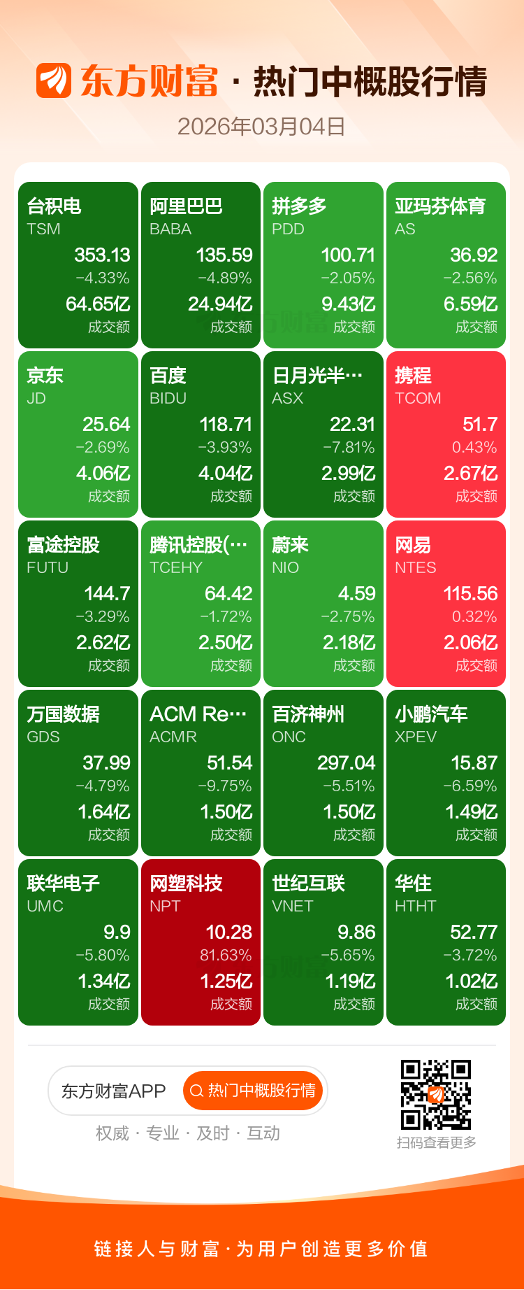 台积电跌4.33%,阿里巴巴跌4.89%,拼多多跌2.05%,亚玛芬体育跌2.56%,京东跌2.69%,百度跌3.93%,日月光半导体跌7.81%,携程涨0.43%,富途控股跌3.29%,腾讯控股(ADR)跌1.72%。